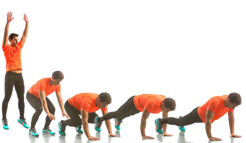 Colócate de pie y realiza un primer salto con los brazos hacia arriba, a continuación déjate caer hacia el suelo y apoya las manos como se aprecia en la imagen, desde la posición agrupada estira las piernas como si fueses a realizar un fondo de brazos. Incorpórate con un salto agrupado hacia delante y comienza de nuevo tantas veces como puedas en 60”.